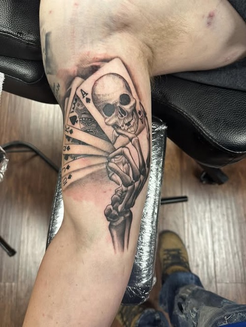 Do you like being a maximalist? Why don’t you opt for this skeleton-themed inner bicep design, perfect for the upcoming holiday season?