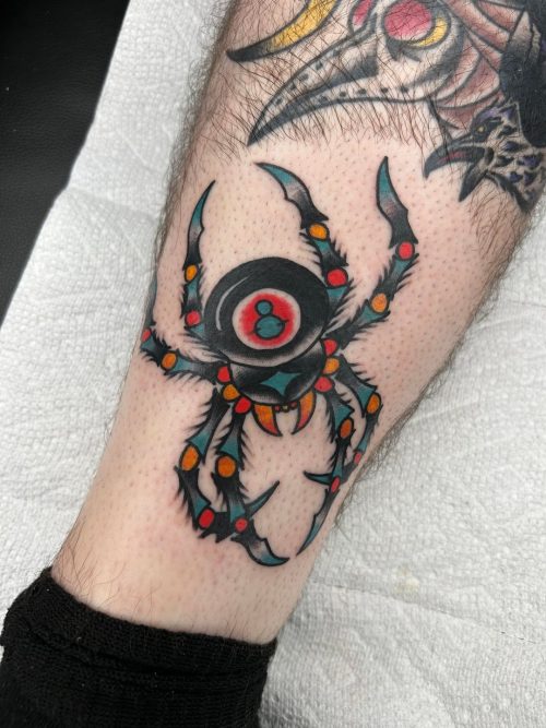 How about a shiny spider tattoo? This piece features stunning stones that catch the eye. Here are some similar glittery tattoos, too.