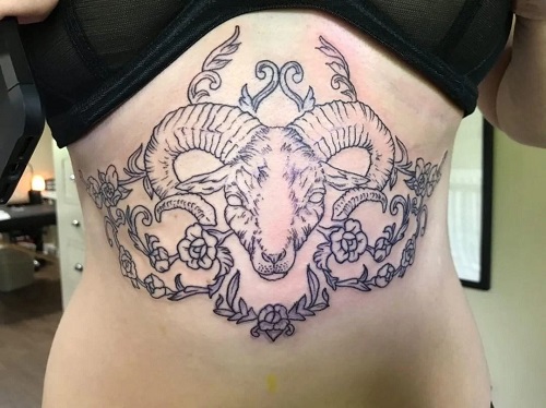 Are you looking for a tattoo that is bold and decorated? A large sheep head tattoo decorated with flowers should be perfect for that!