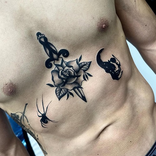 Why not explore this idea, displaying a knife stabbing through a heart? Complete the look with the spider and skull look on either side for some extra flair.