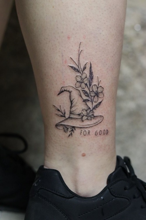 Let’s start with a whimsical piece that you cannot resist. The witchy hat, the tiny florals, and the words “FOR GOOD” all come together to form this beautiful ankle tattoo.