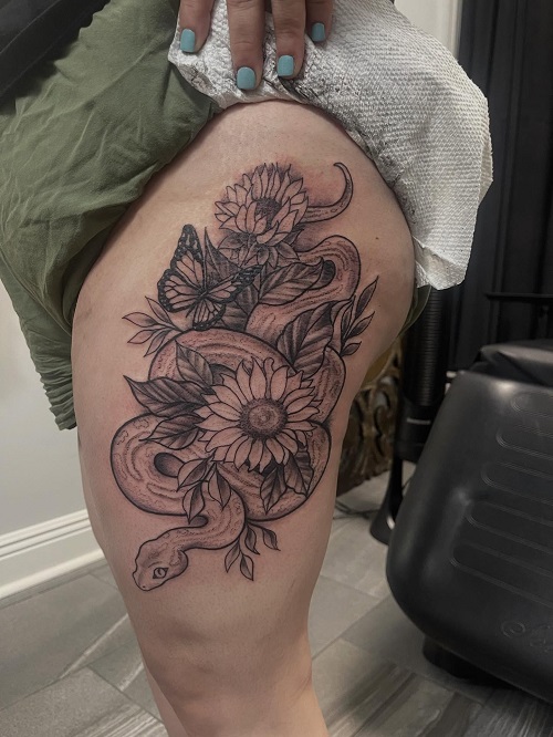 For those who prefer large thigh tattoos, here’s an idea. It is done with motifs such as the snake, florals, and a butterfly.