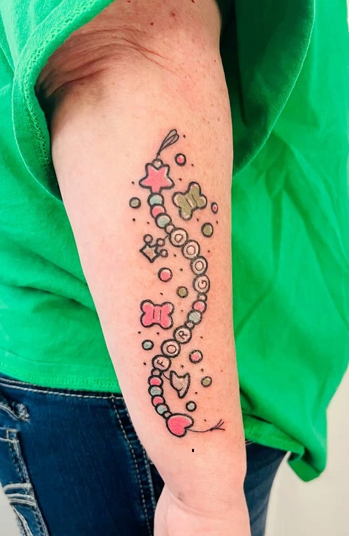 Why not go ahead with a bracelet-like tattoo featuring dainty, colorful beads and charms? Perfect as a minimal sleeve.