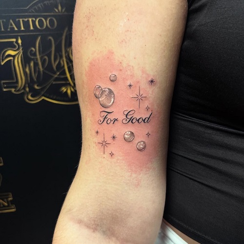 Here’s another intricately detailed yet iconic tattoo that reads “for good,” surrounded by bubbles and stars.